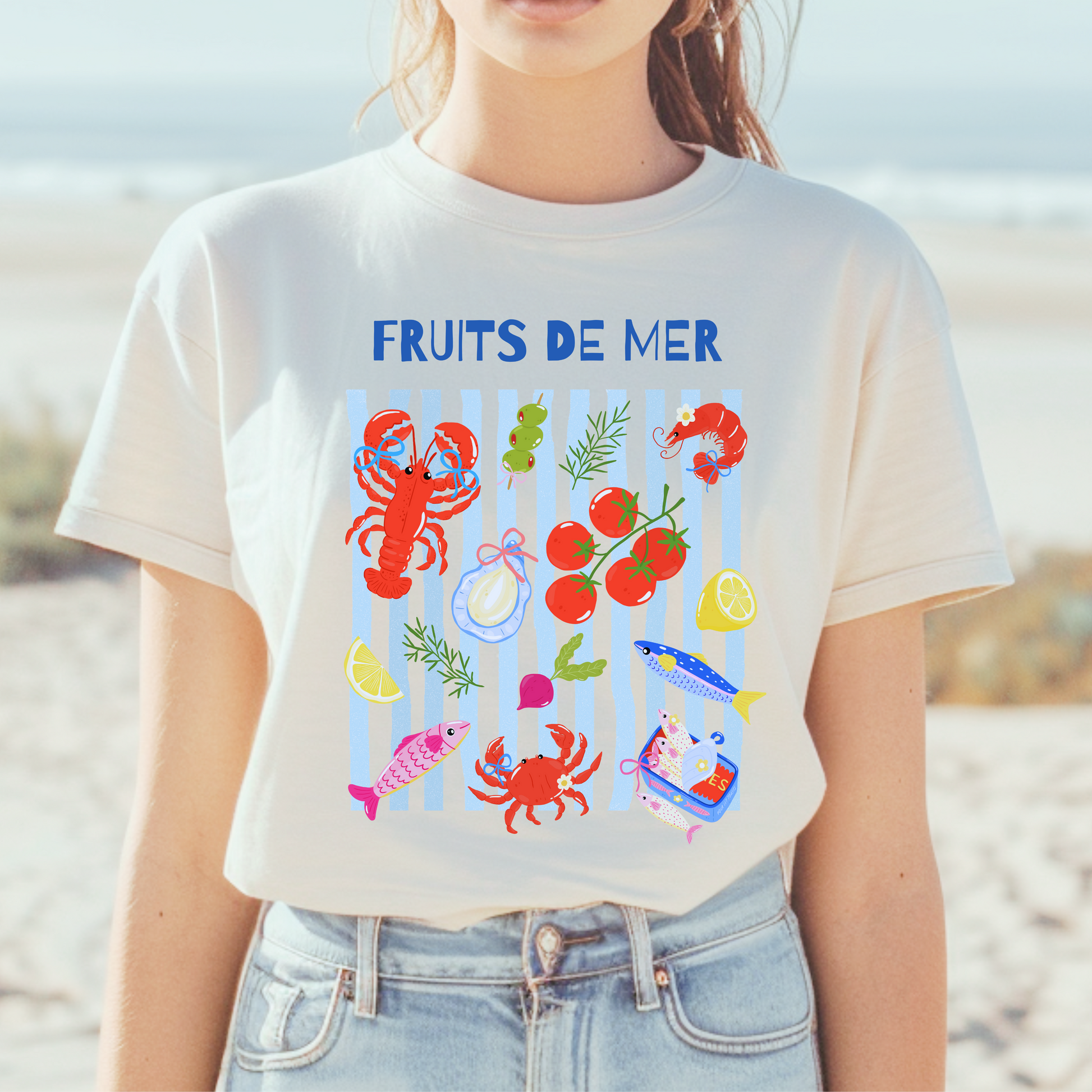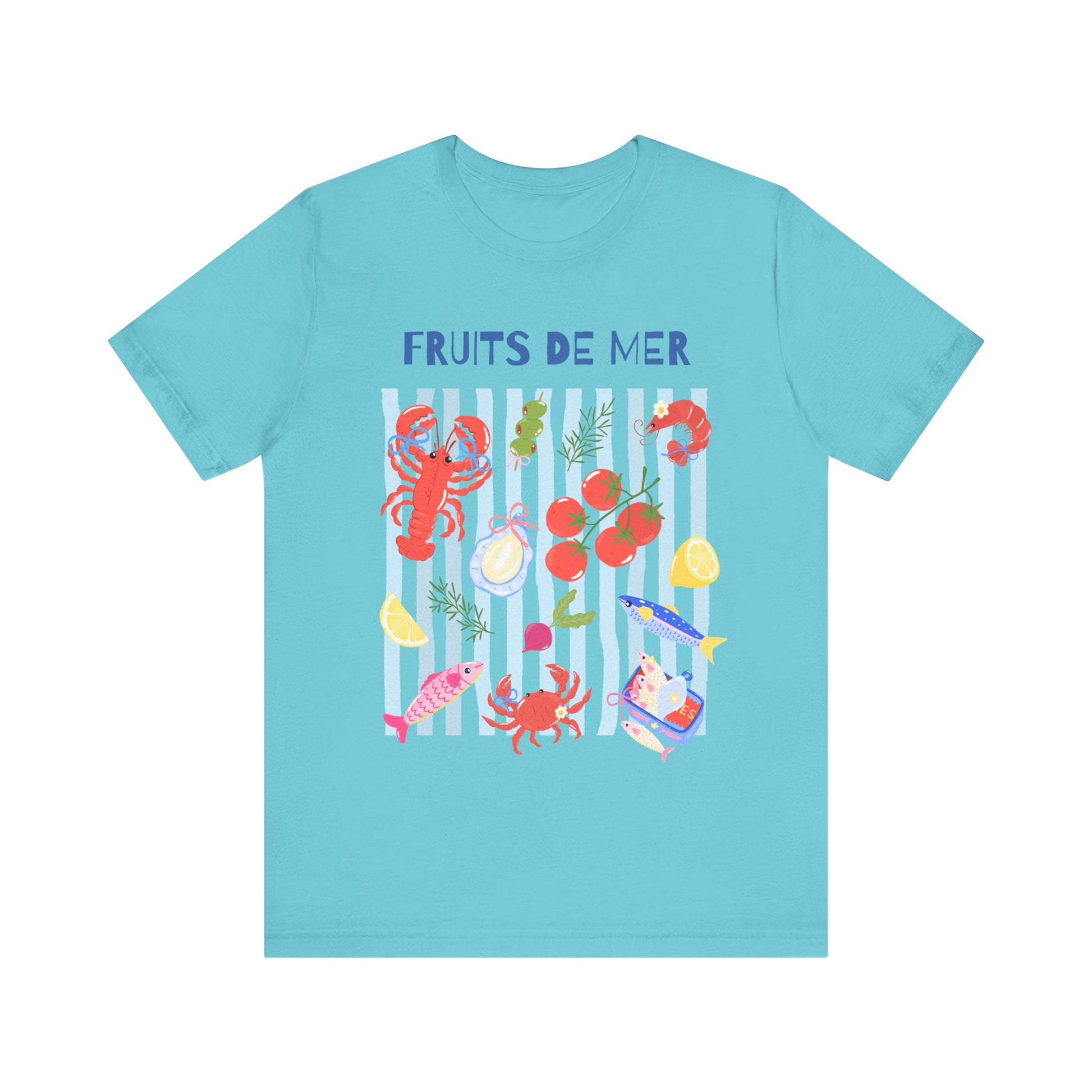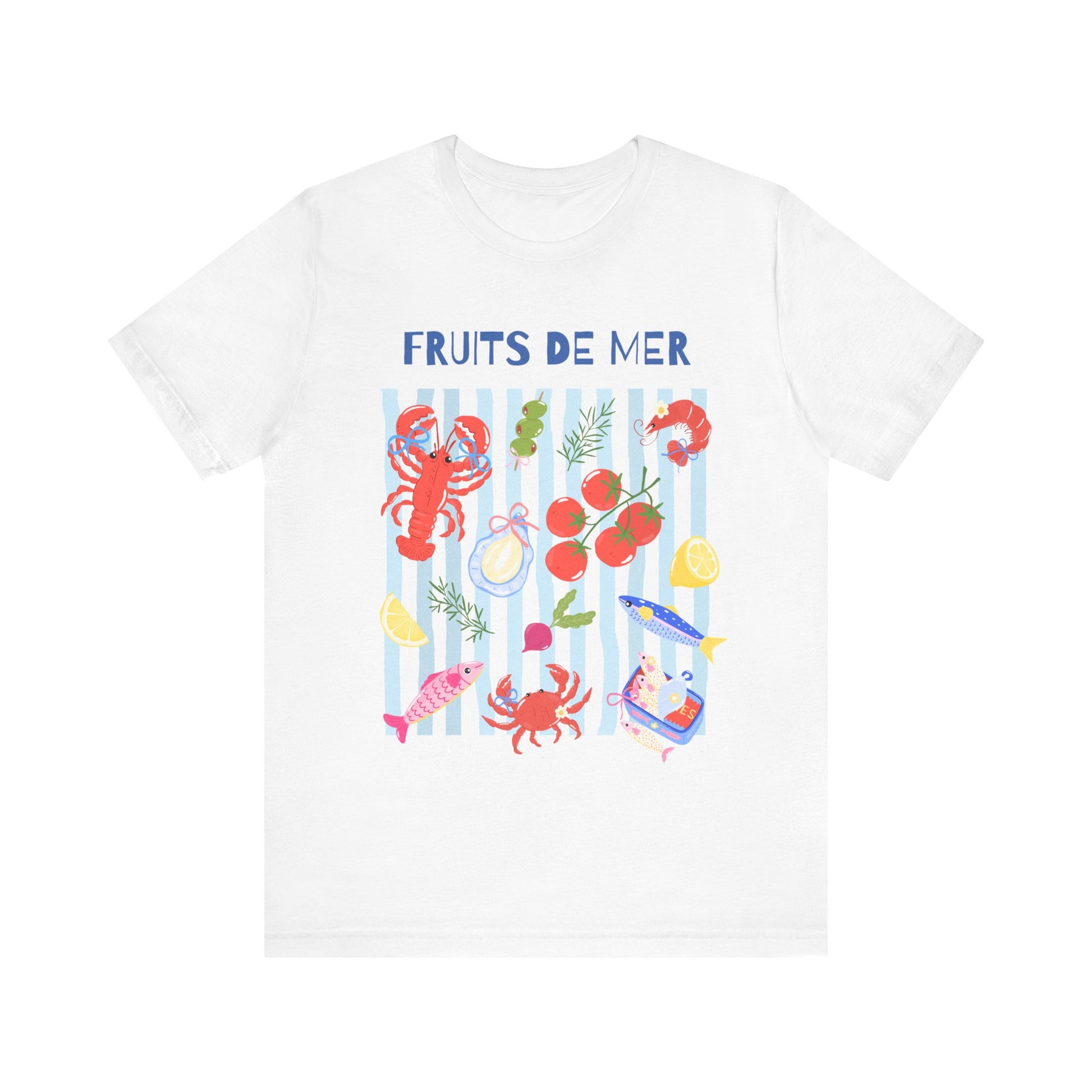 Fruits de Mer (Seafood). This playful tee features a colorful celebration of all things from the sea! A wearable love letter to the Mediterranean coast. 🐟🍅🦐